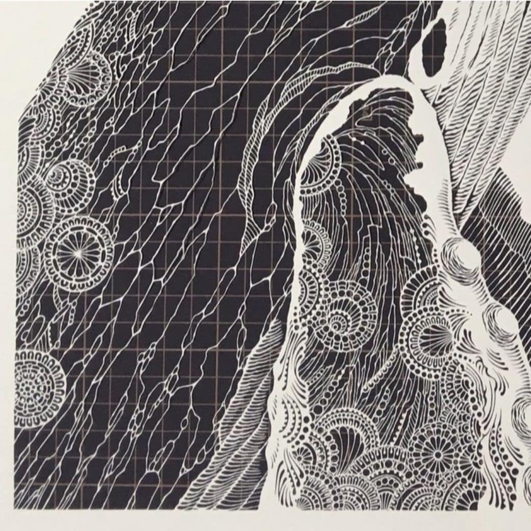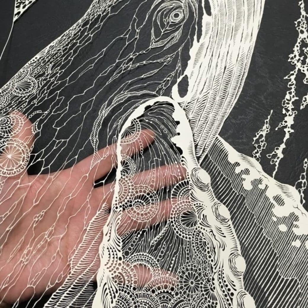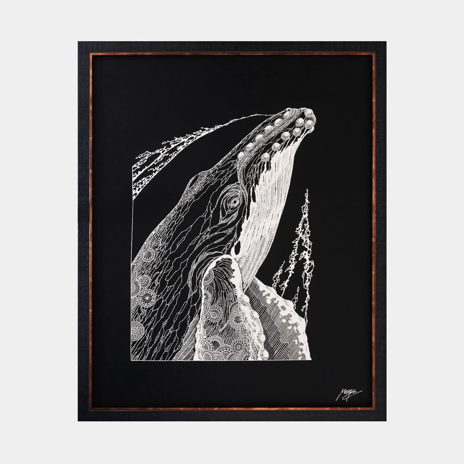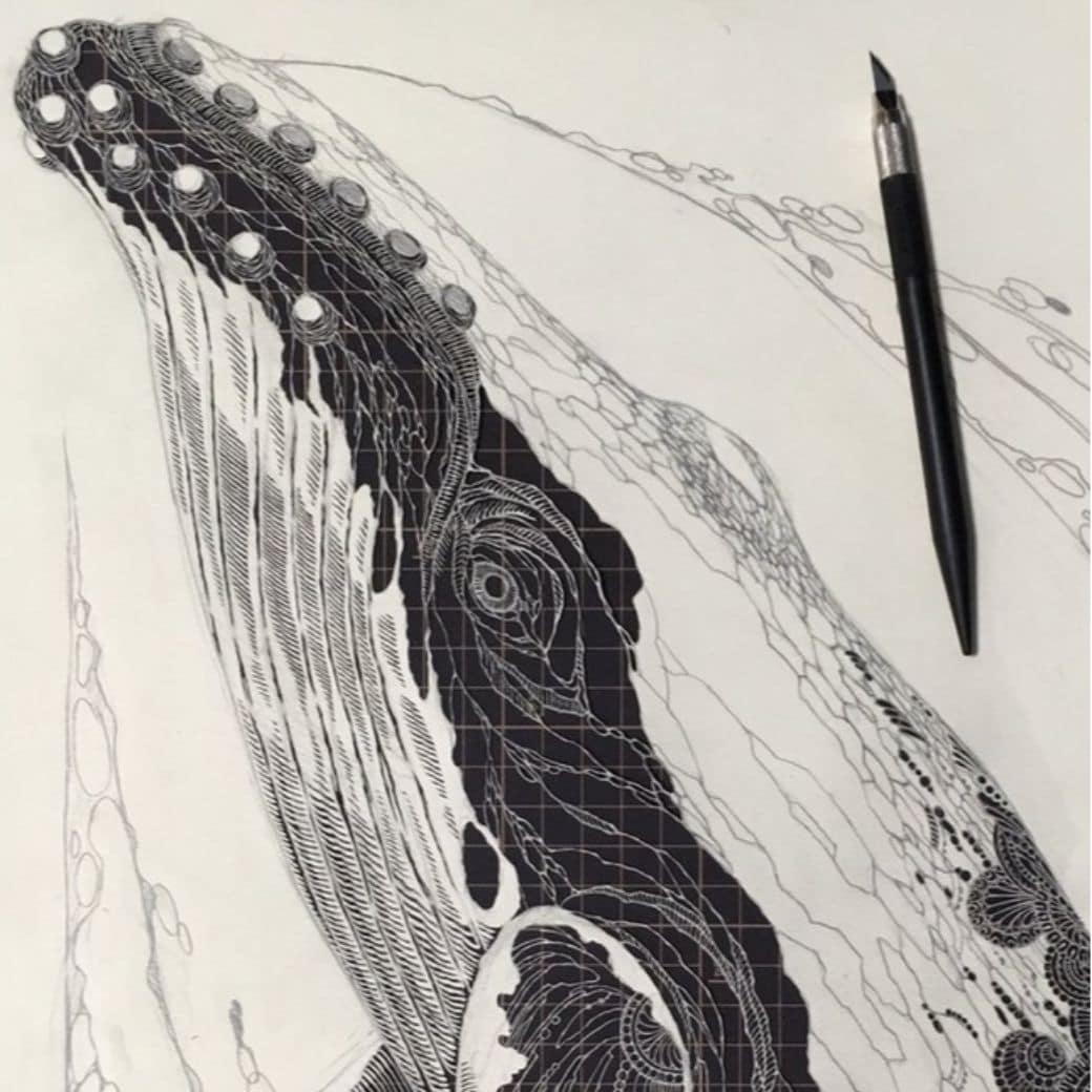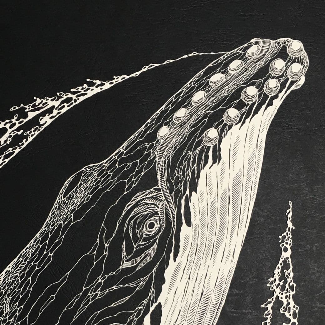 優しげなイメージで描かれることの多いクジラの本来の力強さを表現するため、目の表情や構図にこだわった作品。